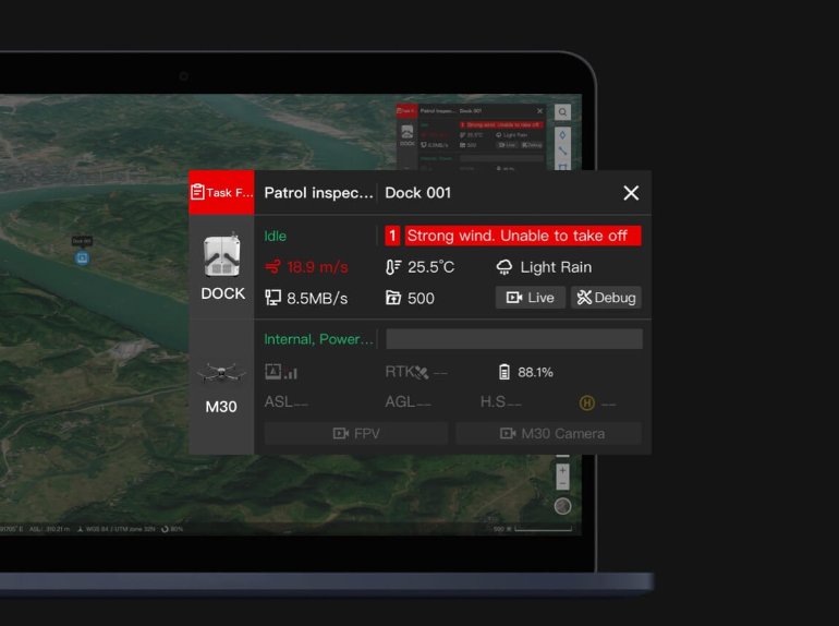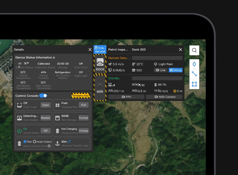 Comprueba el estado del DJI Dock y de la aeronave de forma remota y elimina fallos en el equipo siempre que sea necesario. Mantén en funcionamiento tus operaciones con drones sin constantes revisiones de mantenimiento.