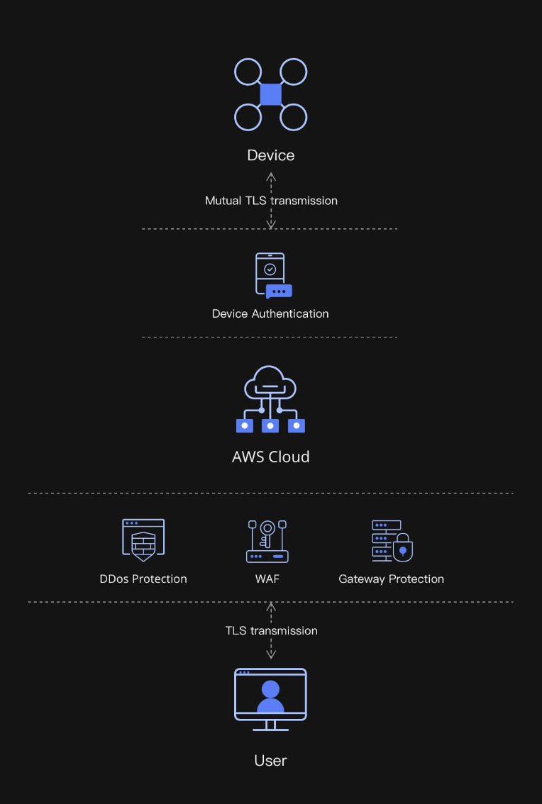 DJI se toma muy en serio la seguridad de tus datos. Utilizamos las mejores medidas del sector para proteger la integridad de tus fotos, vídeos, registros de vuelo y otros datos de usuario, para permitirte usar a plena potencia y con confianza un sistema de gestión de flotas basado en la nube. FlightHub 2 está diseñado para mantener la integridad a través de múltiples niveles del proceso de gestión del dron y de los datos, desde la conexión y el mantenimiento del dispositivo hasta la carga y la transmisión de datos o el almacenamiento y la seguridad operativa.