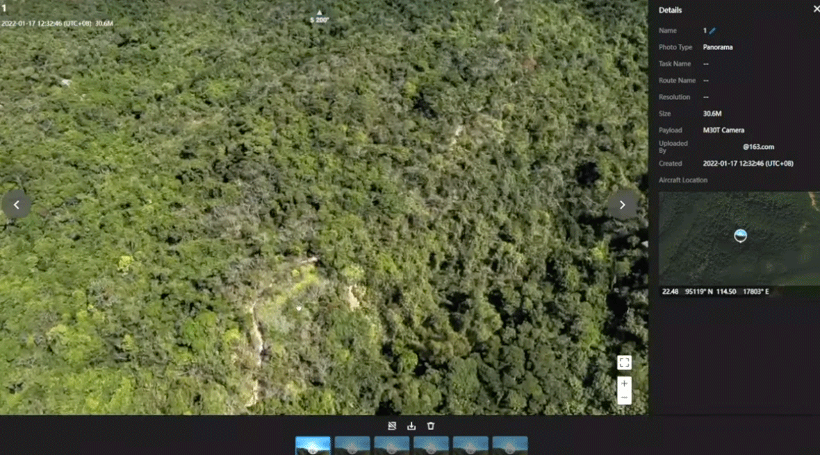 Revisa en la nube los resultados de la operación. Abre cualquier foto, vídeo o panorámica capturados y se mostrarán en el mapa base 2.5D, junto con la información de las coordenadas correspondientes.